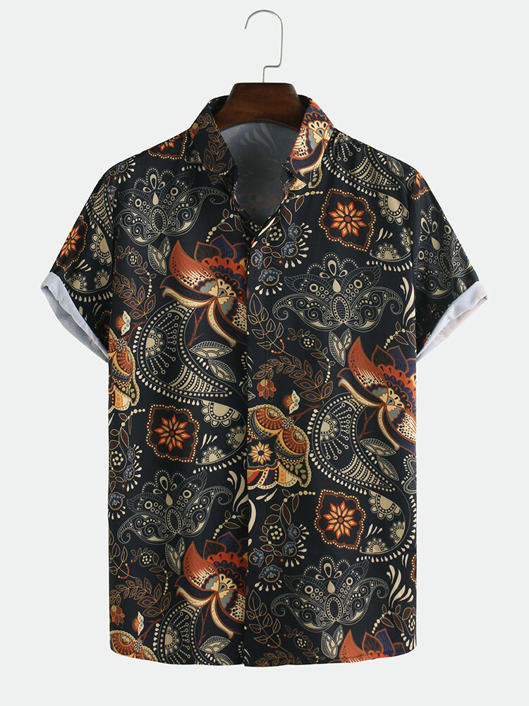 Men Printed Retro Style Summer Casual Short Sleeve Lapel Shirts – S Black