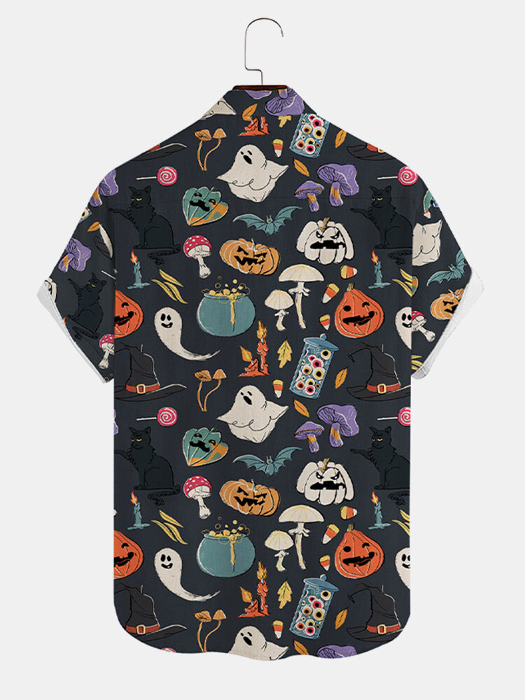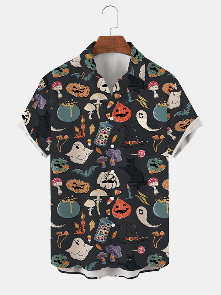 Men Pumpkin Ghost Pattern Chest Pocket Funny Shirts – Black S