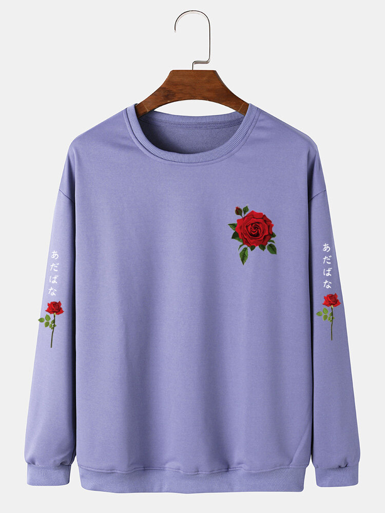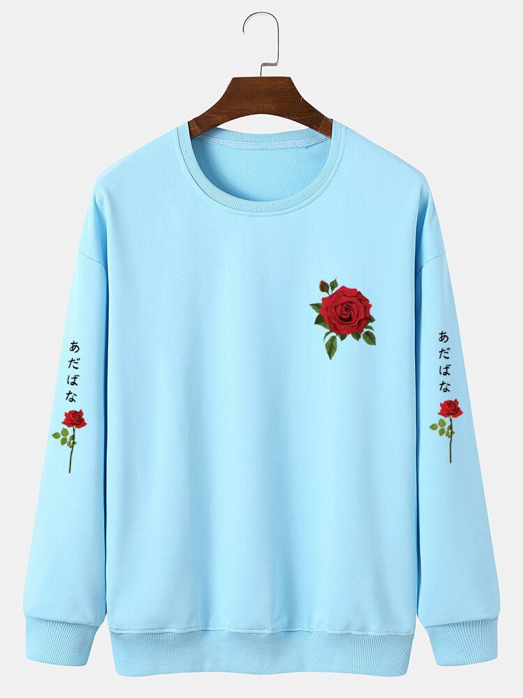 Men Rose Japanese Letter Bodycon Hem Leisure Pullover Sweatshirt – White M