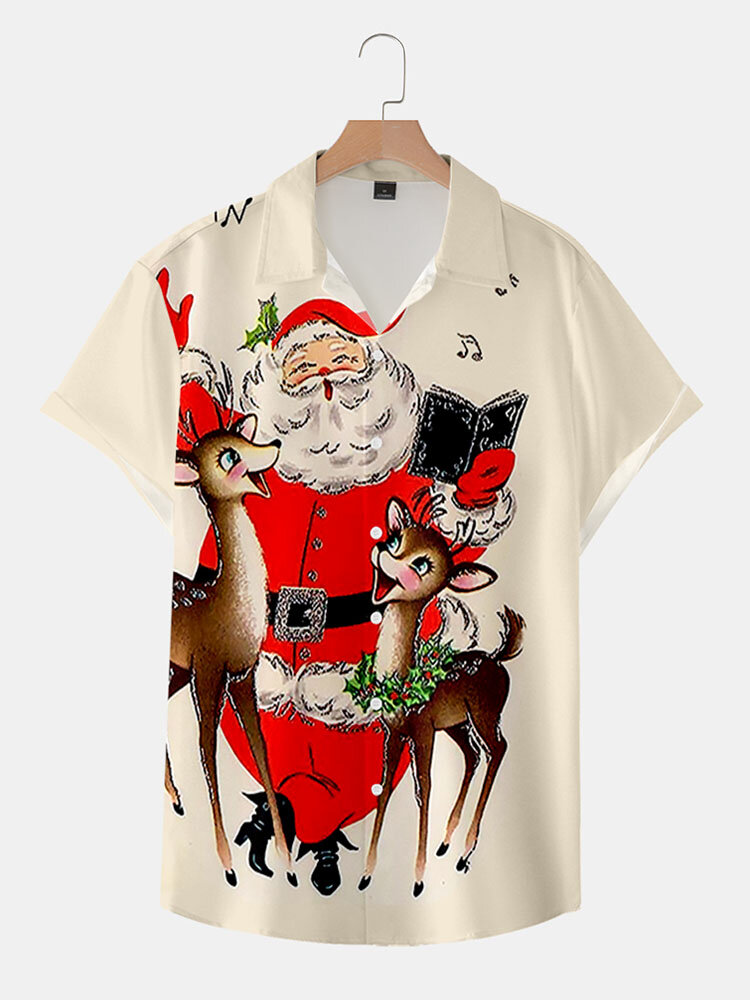 Men Santa Claus Lapel Collar Short Sleeve Casual Shirts – Beige S