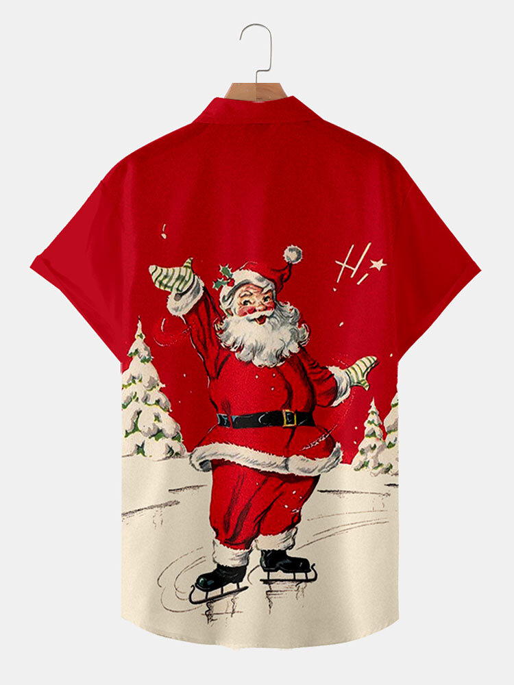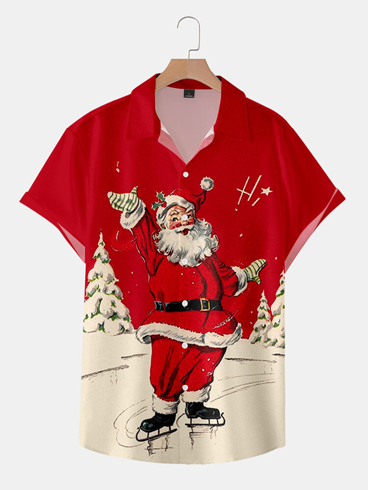 Men Santa Claus Lapel Collar Short Sleeve Casual Shirts – Red M