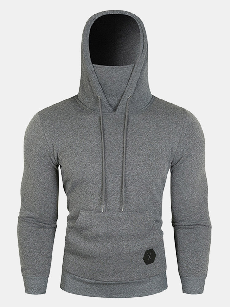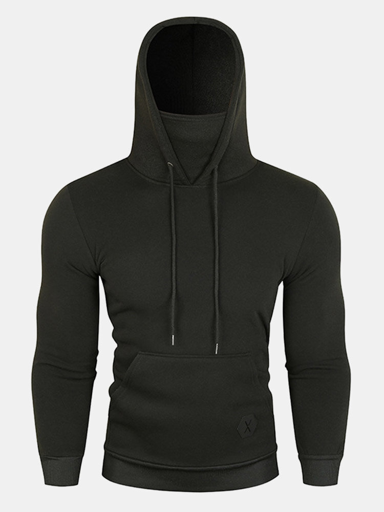 Men Solid Drawstring Fleece High Neck Sport with Front Pockets Hooded Sweatshirt – Black L
