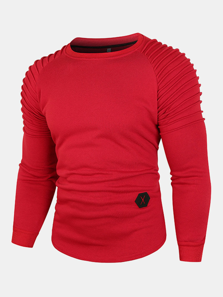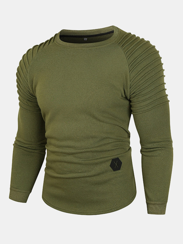 Men Solid Fleece Pleated Crew Neck Casual Pullover Sweatshirt – Black M