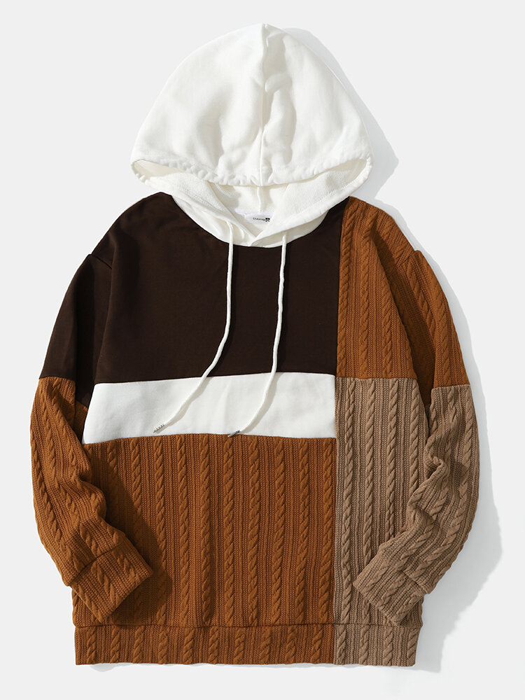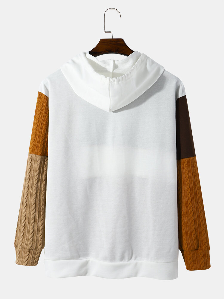 Men Splicing Cable Knitted Color Block Drawstring Pullover Hooded Sweatshirt – White S