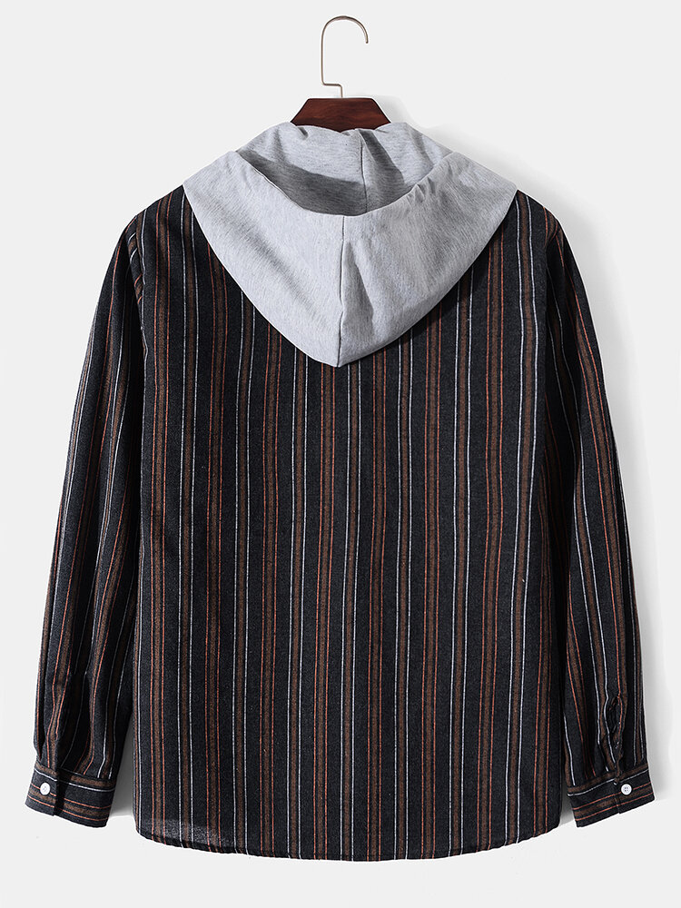 Men Striped Button Drawstring Simple Long Sleeve Hooded Shirt – Black S