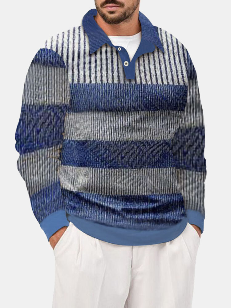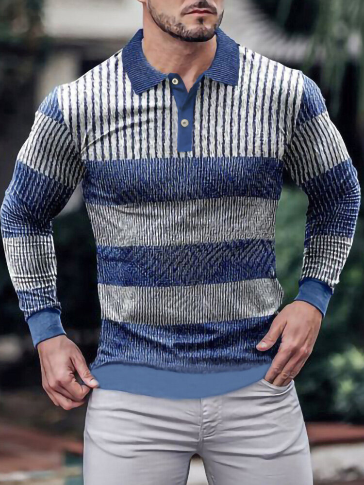 Men Striped Color Block Button Long Sleeve Casual Pullover Golf Shirts – Blue M