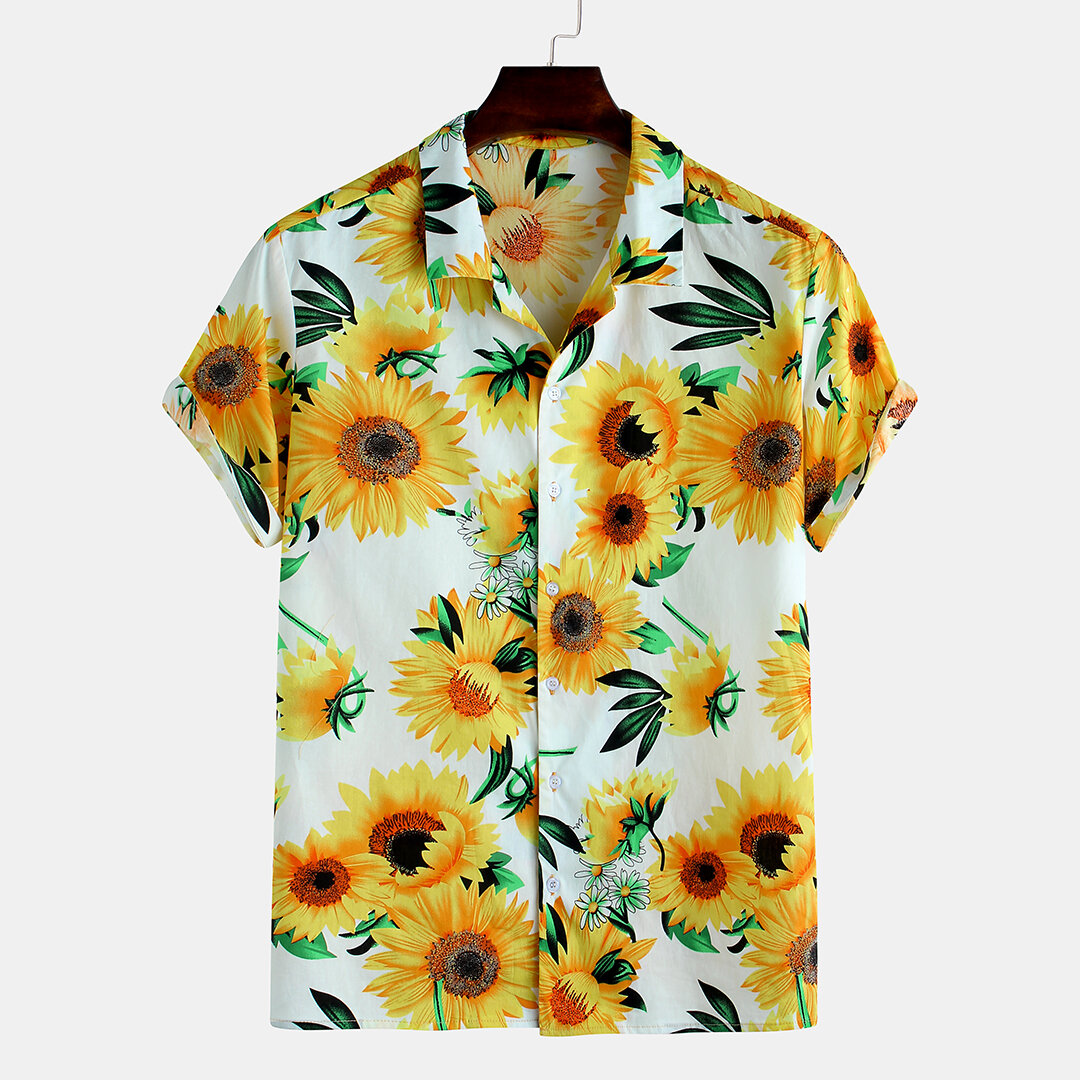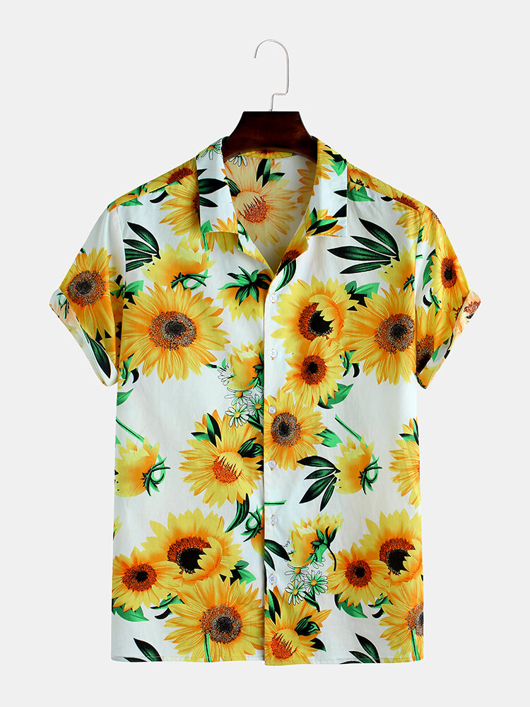 Men Sunflower Printed Hawaiian Style Cotton Short Sleeve – 3XL White