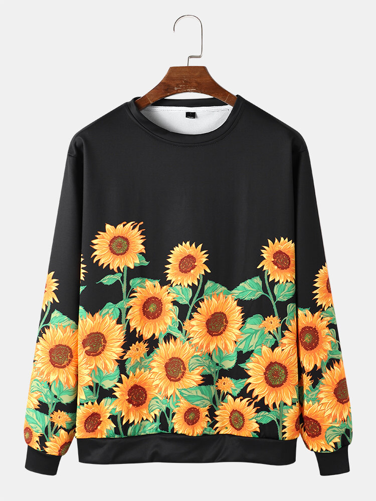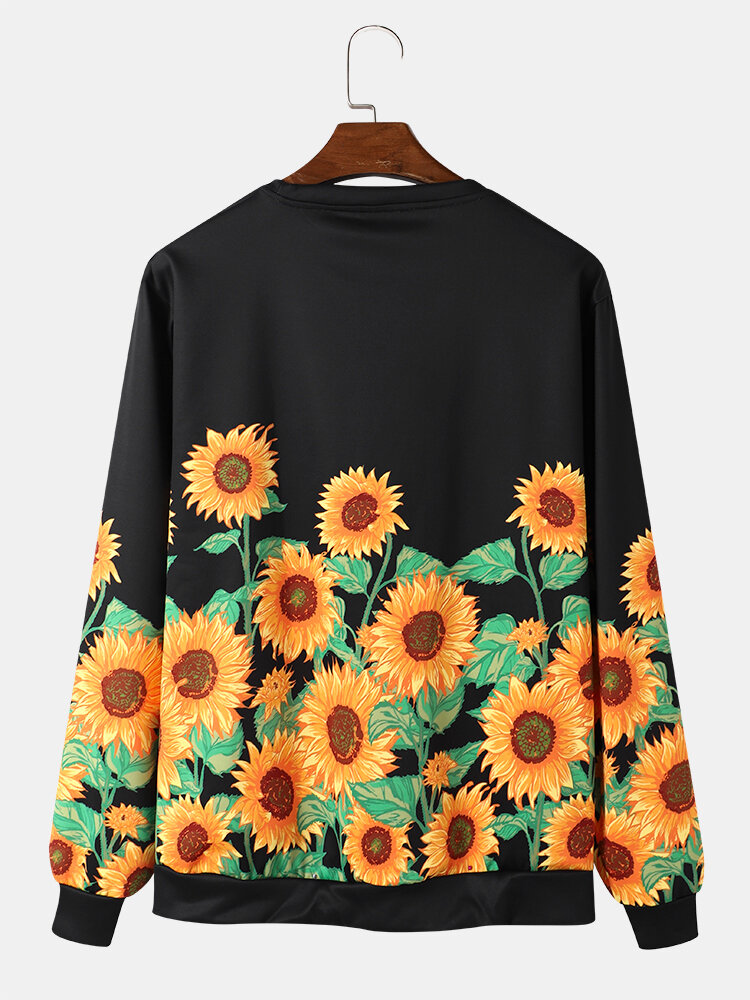 Men Sunflowers Printed Pullover Round Neck Long Sleeve Sweatshirts – Black S