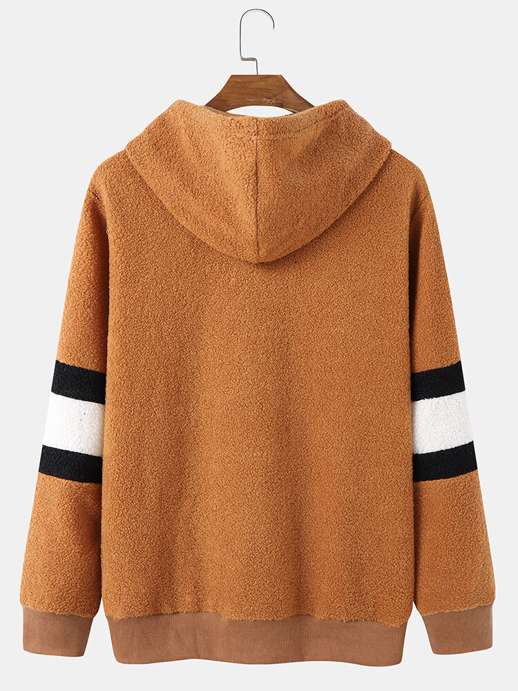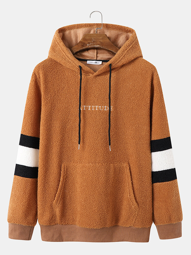 Men Teddy Fleece Strip Sleeve Letter Kangaroo Pocket Drawstring Hooded Sweatshirt – Brown S