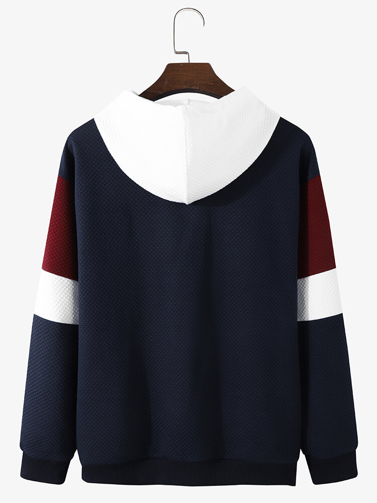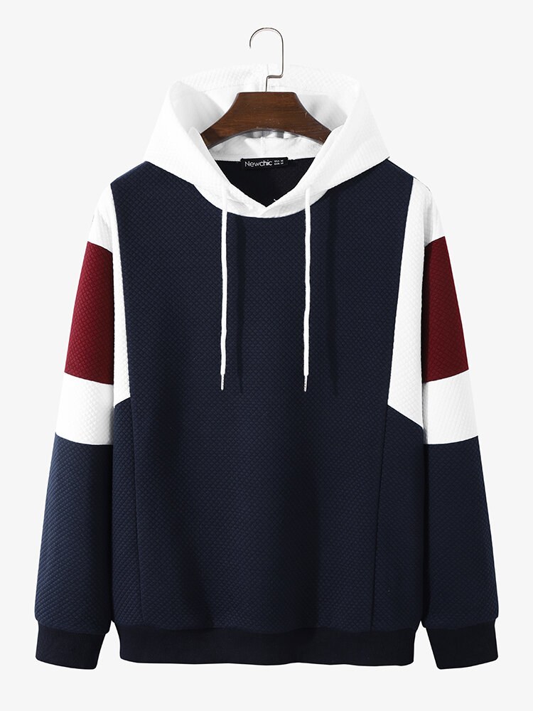Men Texture Colorblock Stitching Loose Casual Drawstring Hoodies – Navy S
