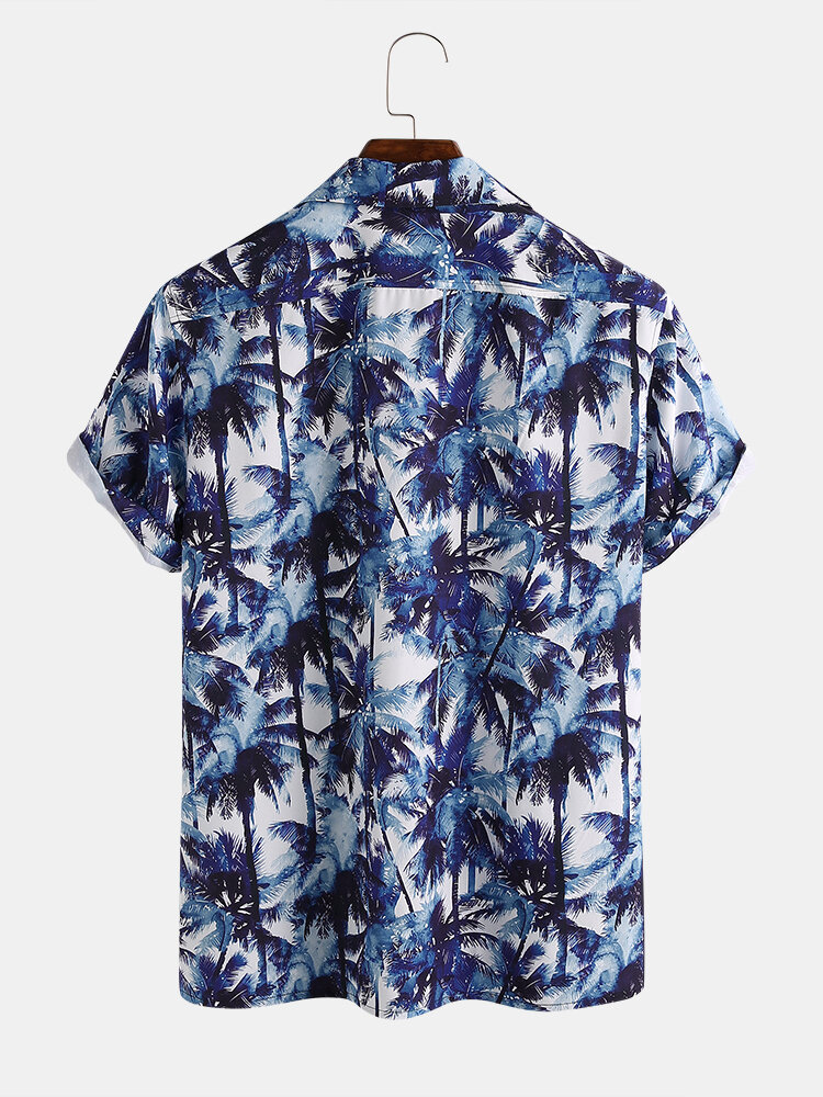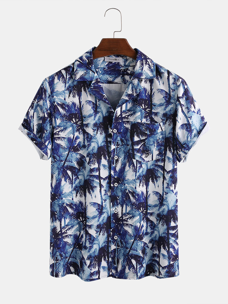 Men Tropical Coconut Tree Gradient Printed Turn Down Collar Pocket Short Sleeve Hawaii Beach Shirts – Blue M