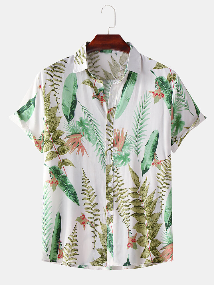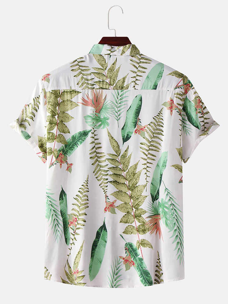 Men Tropical Plant Leaves Print Turn Down Collar Hawaii Beach Short Sleeve Shirts – White S