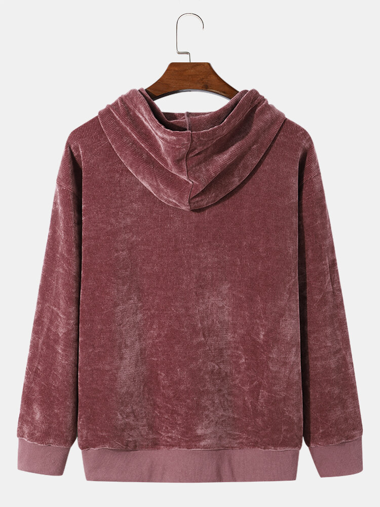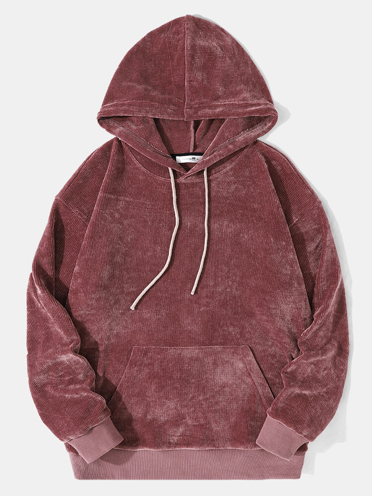 Men Velvets Corduroy Solid Color Kangaroo Pocket Hooded Sweatshirt – Red S