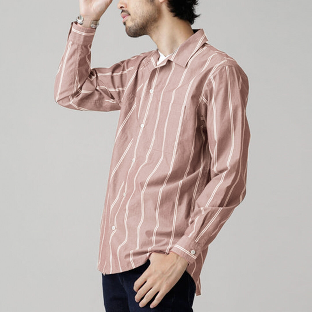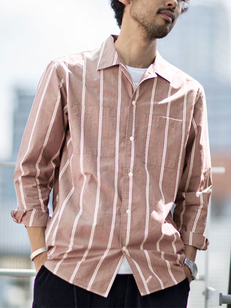 Men Vertical Stripe Dual Pockets Cotton Loose Shirts – M Pink