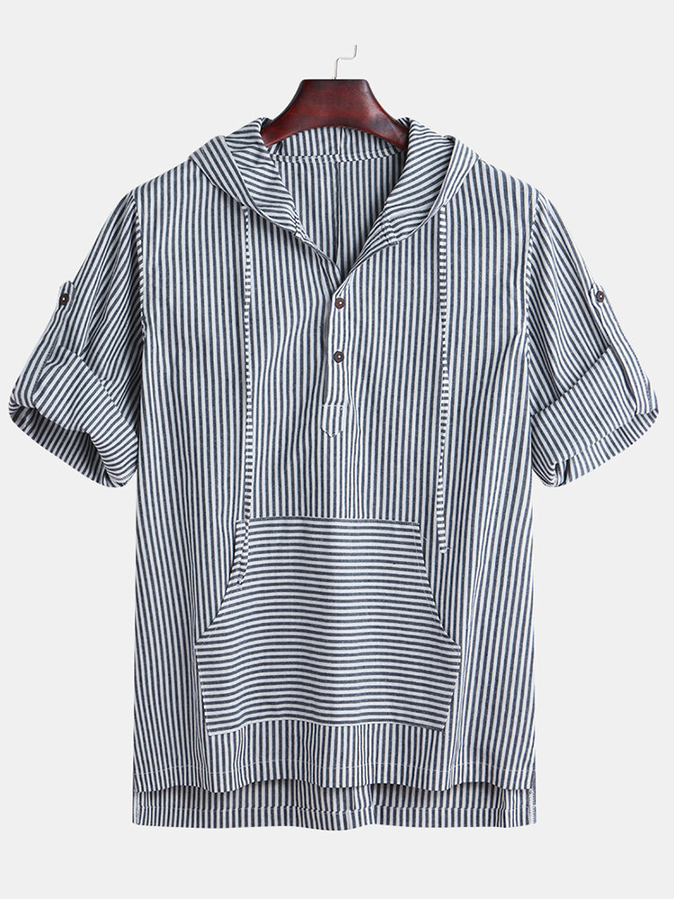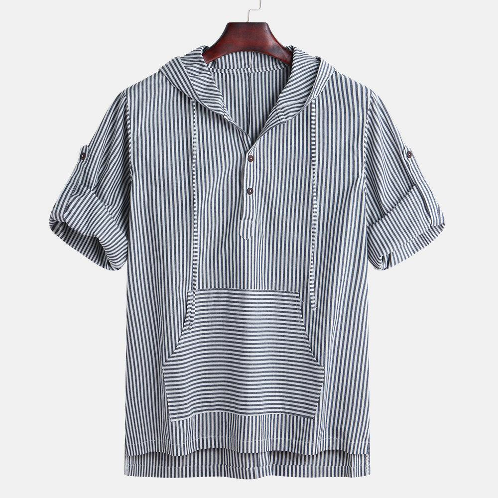 Men Vertical Stripe Half Sleeve Relaxed Hooded Henley Shirts – M Blue
