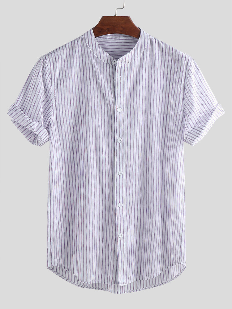 Men Vertical Stripe Relaxed Short Sleeve Shirts – L Purple
