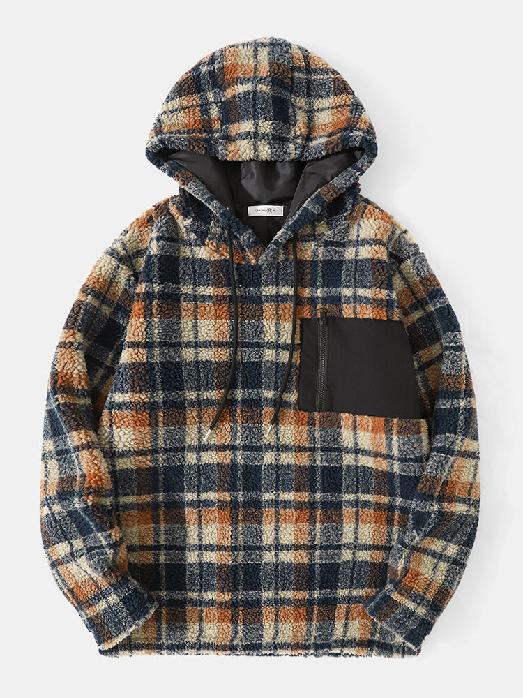 Men Vintage Fleece Patch Pocket Contrast Plaid Drawstring Hooded Sweatshirt – Brown S