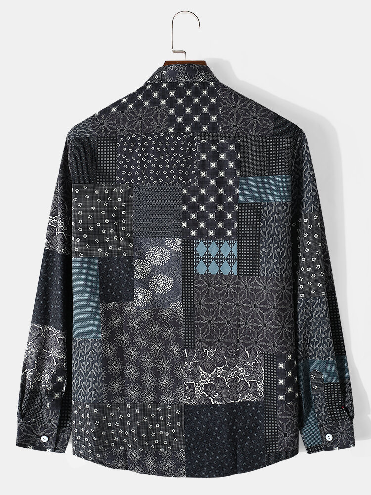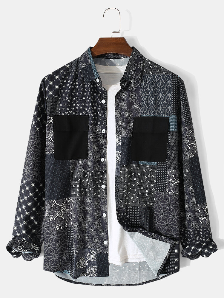 Men Vintage Floral Geo Mix Print Lapel Casual Button up Shirts – Black 2XL