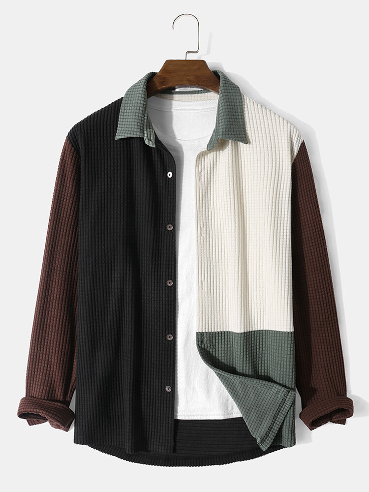 Men Waffles Texture Spliced Colorblock Lapel Collar Buttons Long Sleeve Shirts – Black S