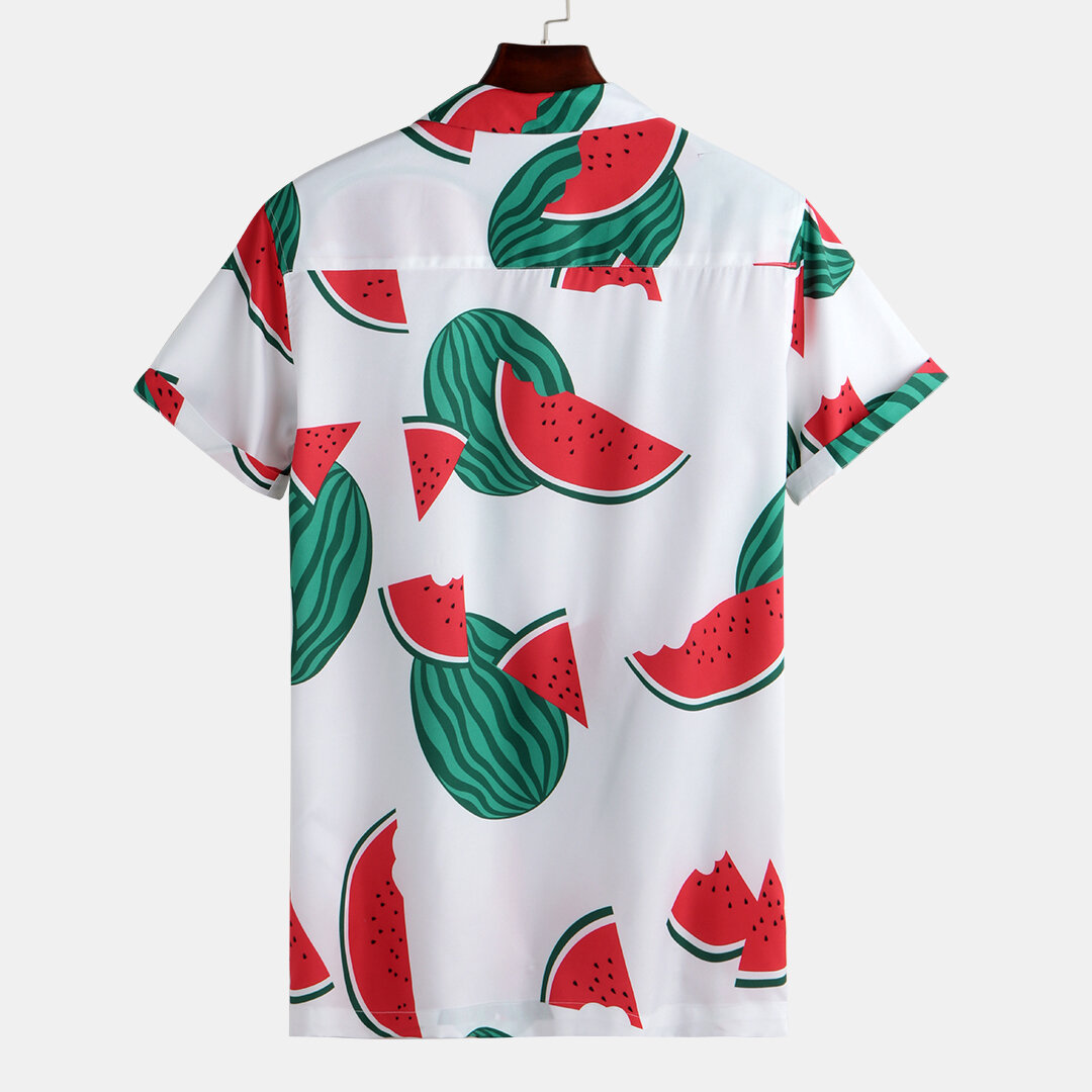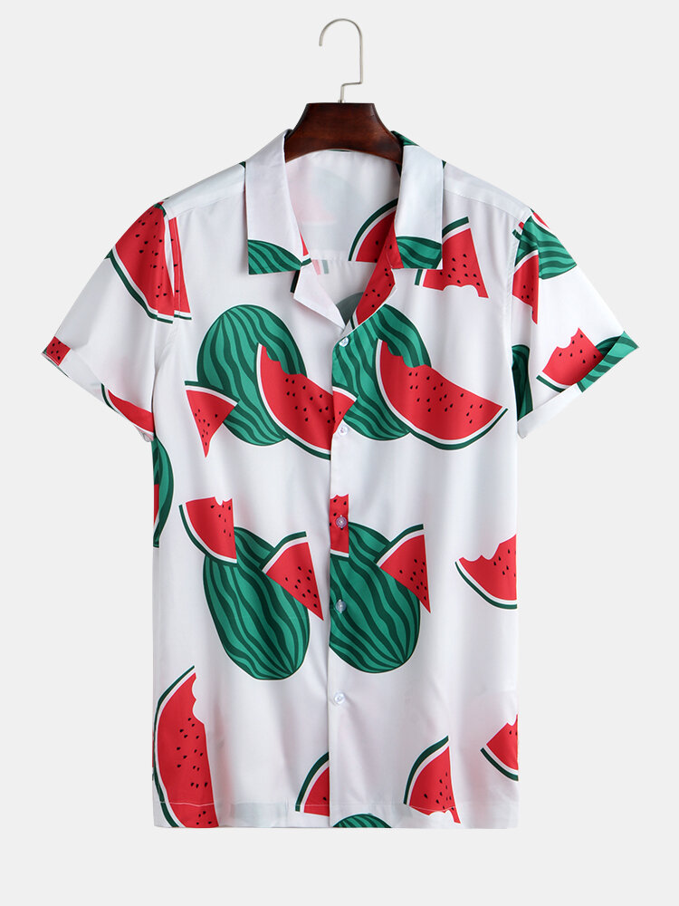 Men Watermelon Print Short Sleeve Hawaiian Revere Shirts – 3XL White