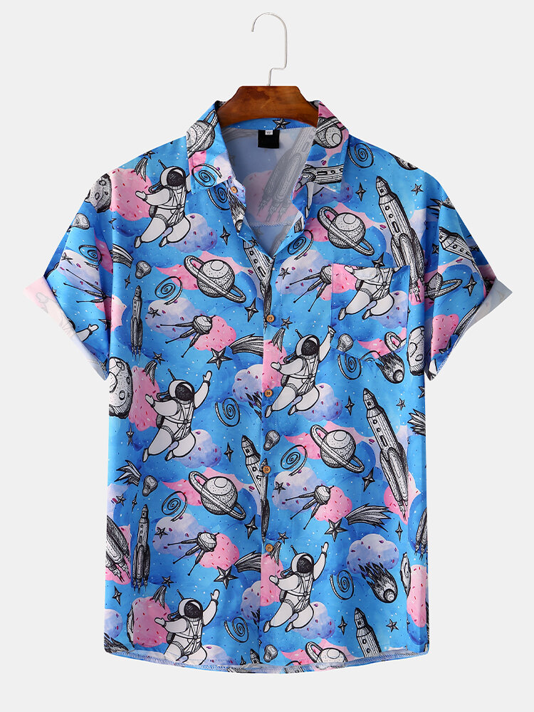 Men Women Fashion Space Graffiti Cloud Print Hawaii Turn Down Collar Shirts – Blue XL