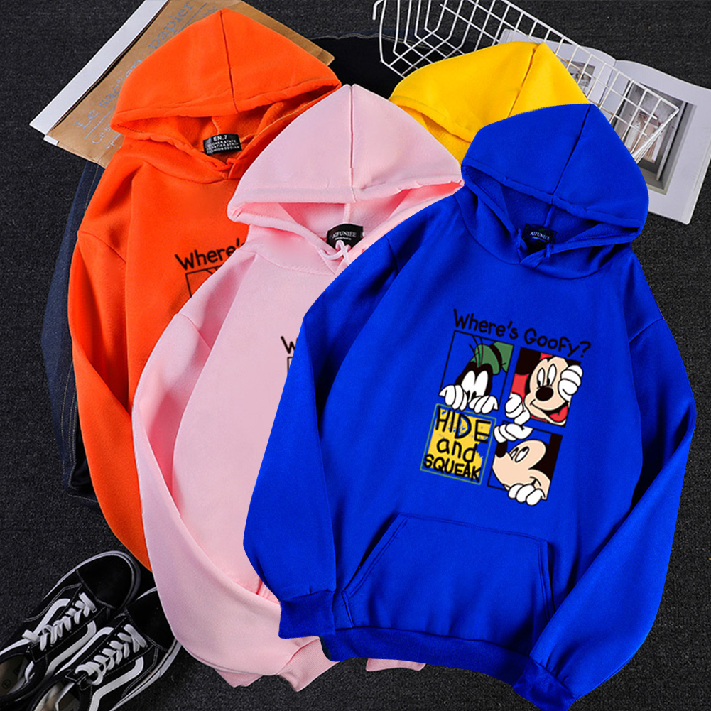 Unisex thicken hoodie sweatshirt, unique and fashion. Cartoon Micky mouse pattern with big kangaroo pocket to the front. Long sleeves with ribbed cuffs and hem. Soft and breathable material, comfortable to wear. Suitable for casual daily wear, travel, street, beach, and etc.