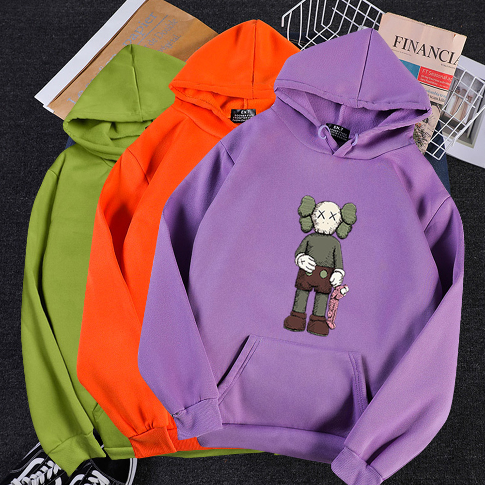 Unisex thicken hoodie sweatshirt, unique and fashion. KAWS cartoon standing doll pattern with big kangaroo pocket to the front. Long sleeves with ribbed cuffs and hem. Soft and breathable material, comfortable to wear. Suitable for casual daily wear, travel, street, beach, and etc.