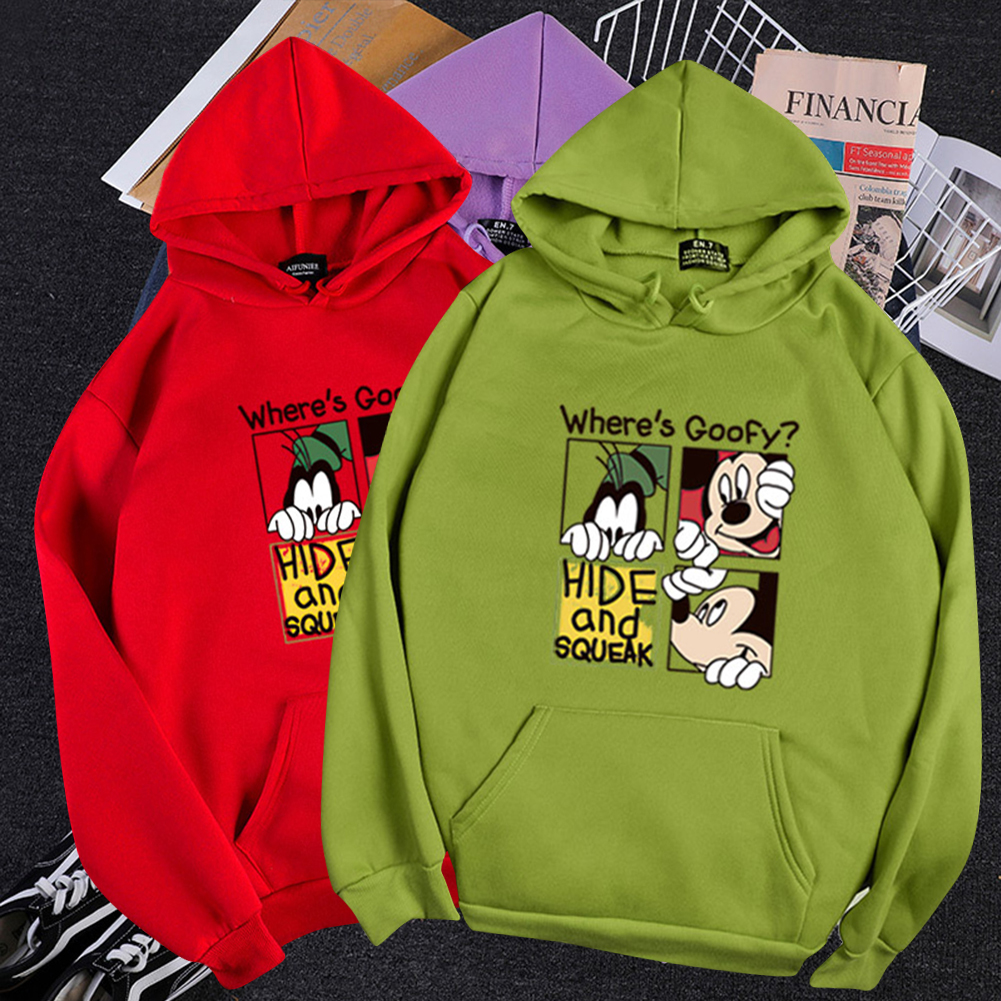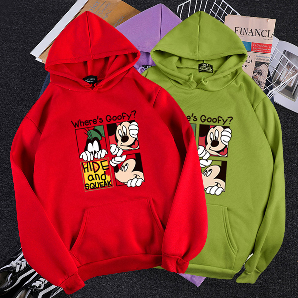 Unisex thicken hoodie sweatshirt, unique and fashion. Cartoon Micky mouse pattern with big kangaroo pocket to the front. Long sleeves with ribbed cuffs and hem. Soft and breathable material, comfortable to wear. Suitable for casual daily wear, travel, street, beach, and etc.