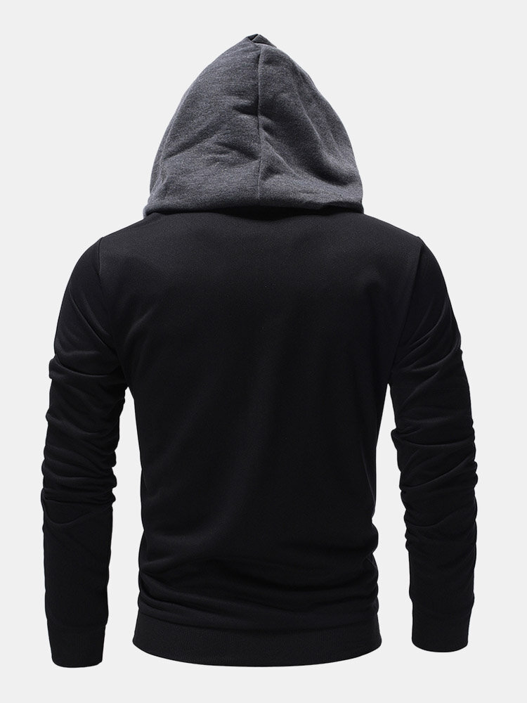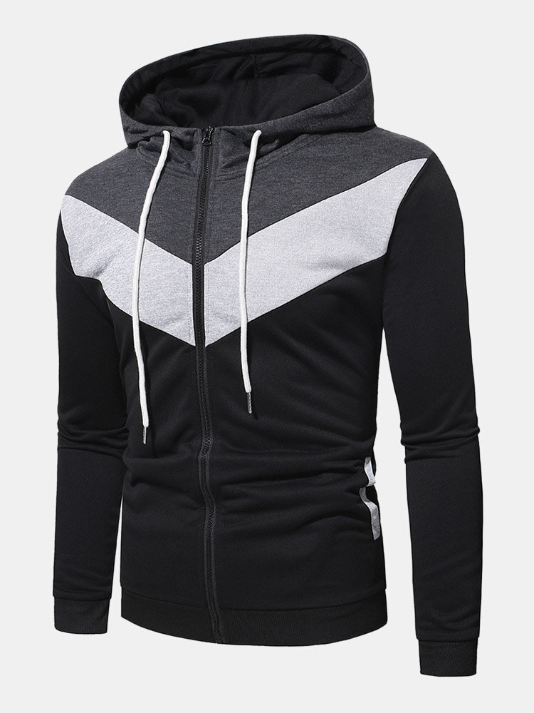 Men Zip Hoodies Patchwork Color Block Pockets Hooded Sweatshirt – Black M