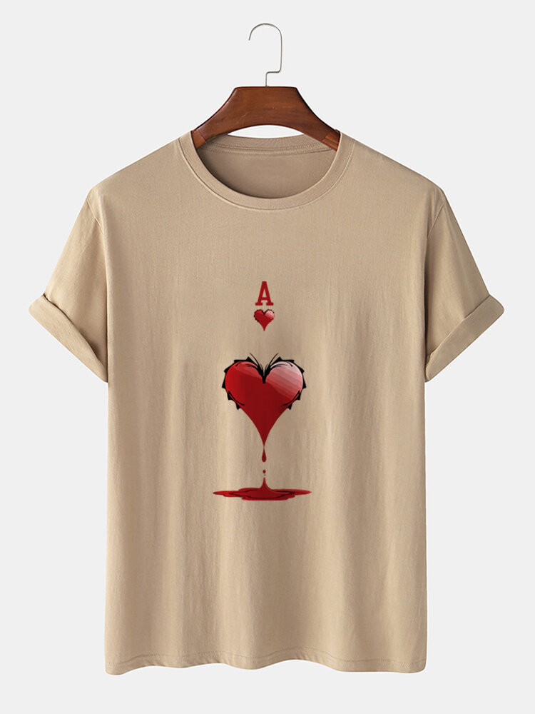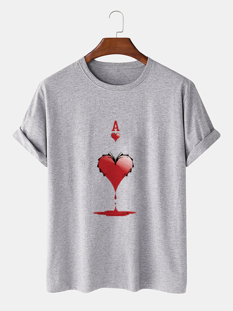 Mens 100% Cotton Ace Of Hearts Poker Print Short Sleeve T-Shirts – Grey M