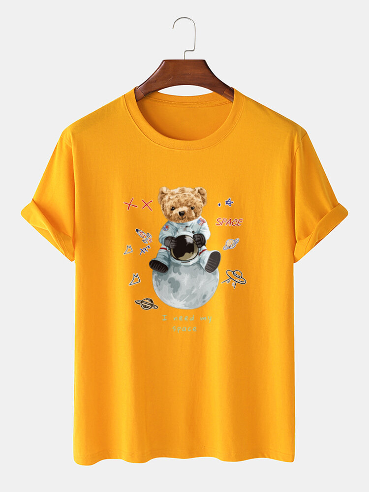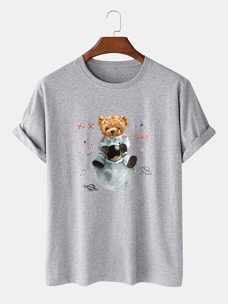 Mens 100% Cotton Astronaut Bear Print Cute Short Sleeve T-Shirts – Black L