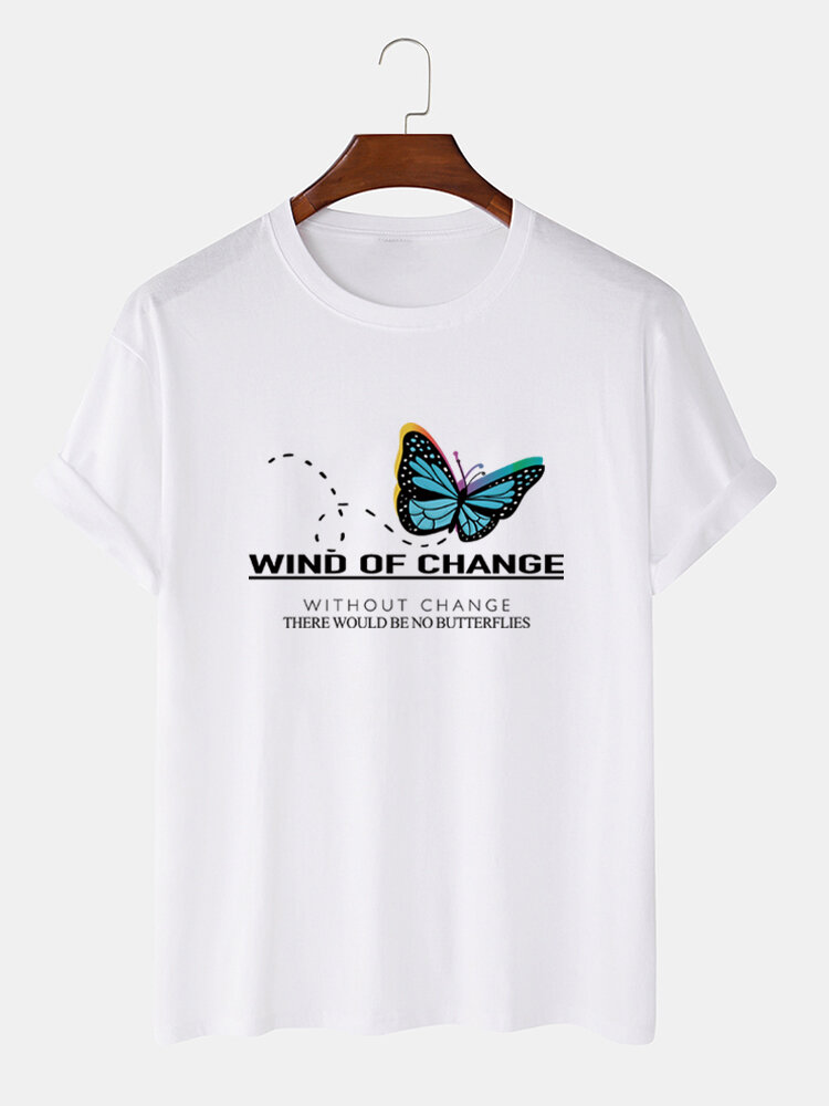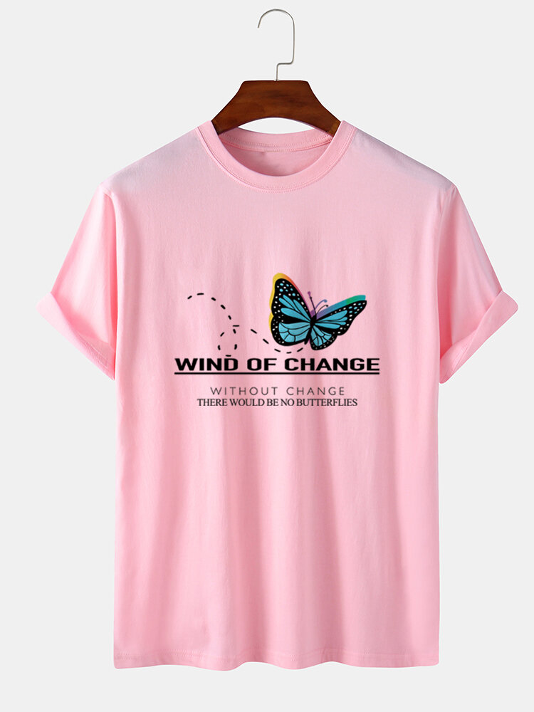 Mens 100% Cotton Butterfly & Letter Pattern Short Sleeve T-Shirts – Light Blue L
