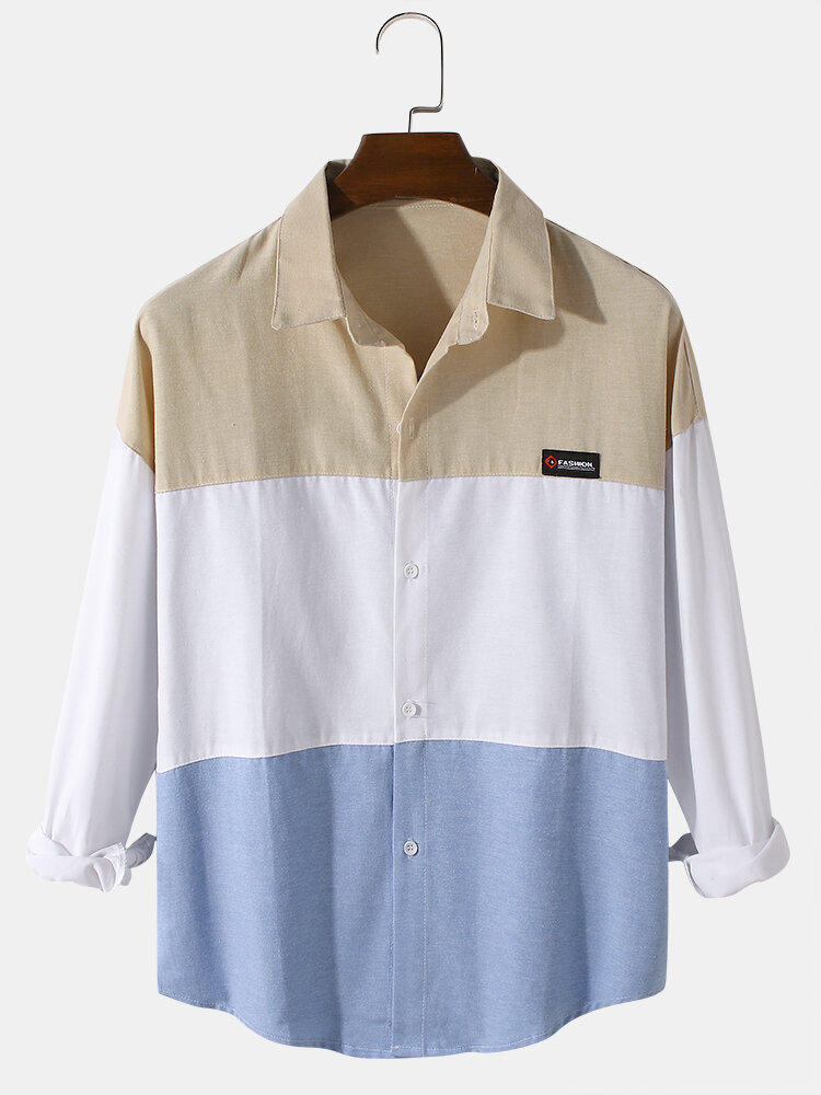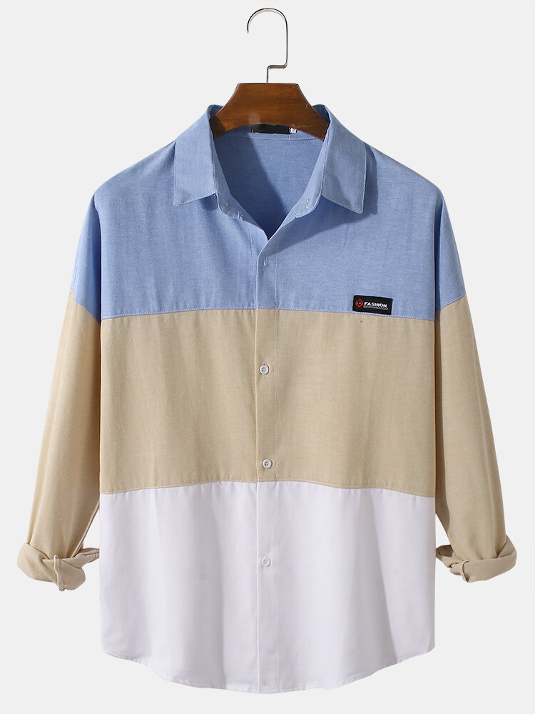Mens 100% Cotton Colorblock Panel Patchwork Relaxed Fit Long Sleeve Shirts – Sky Blue S
