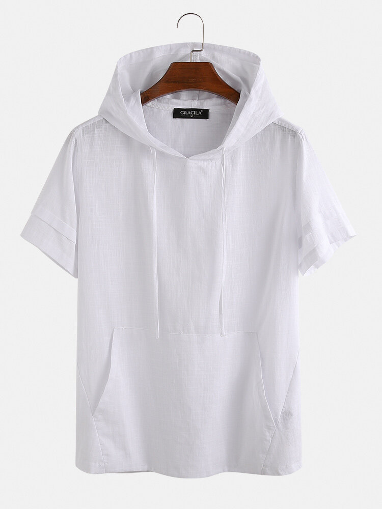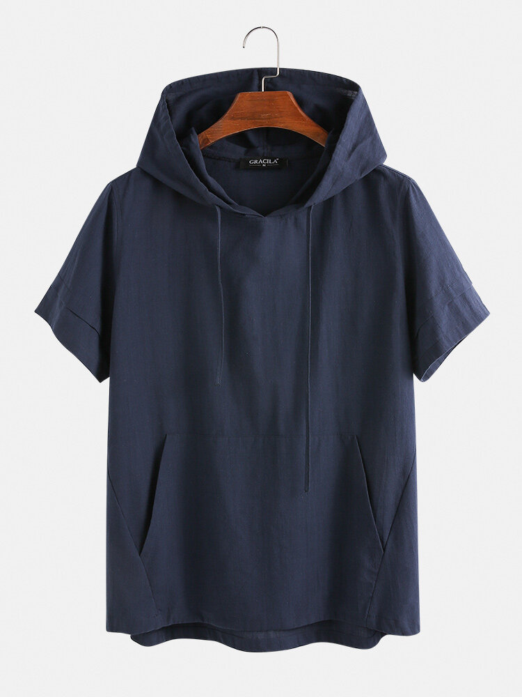 Item Type: T-ShirtsPattern Type: SolidGender: MenFit Type: FitStyle: Casual,FashionThickness: RegularCollar: HoodedSeason: SummerDecorations: PocketMaterial:CottonSleeve Length: Short SleeveColor: Blue,WhiteCuff Type: Straight SleeveOccasion: Leisure,Home,Daylife