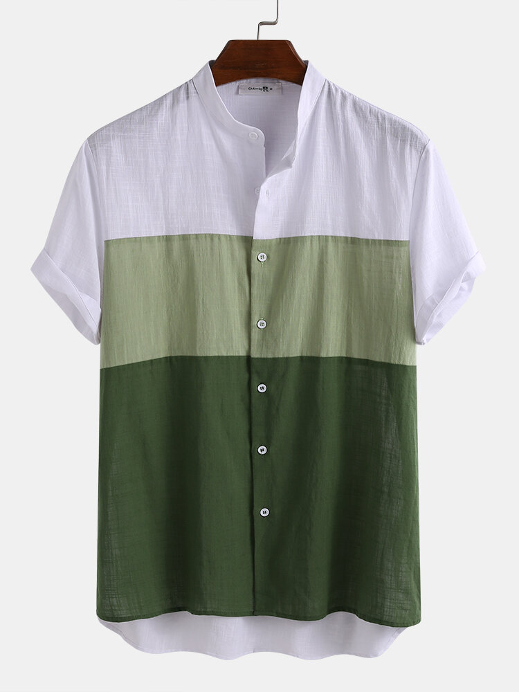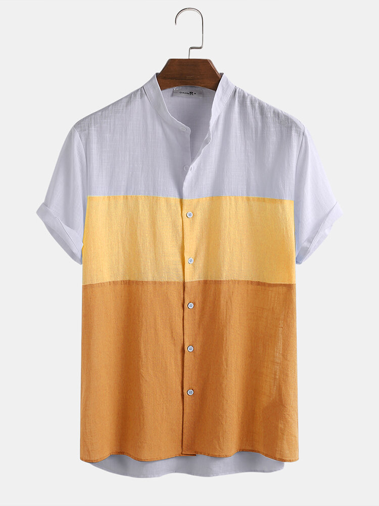 Mens 100% Cotton Gradient Color Block Patchwork Stand Color Casual Short Sleeve Shirts – Yellow 3XL