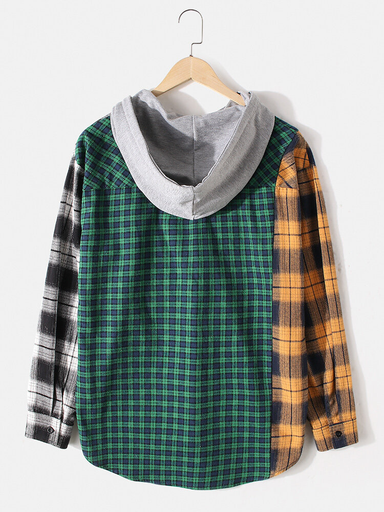 Mens 100% Cotton Muti Color Plaid Patchwork Long Sleeve Hooded Shirts – S Black