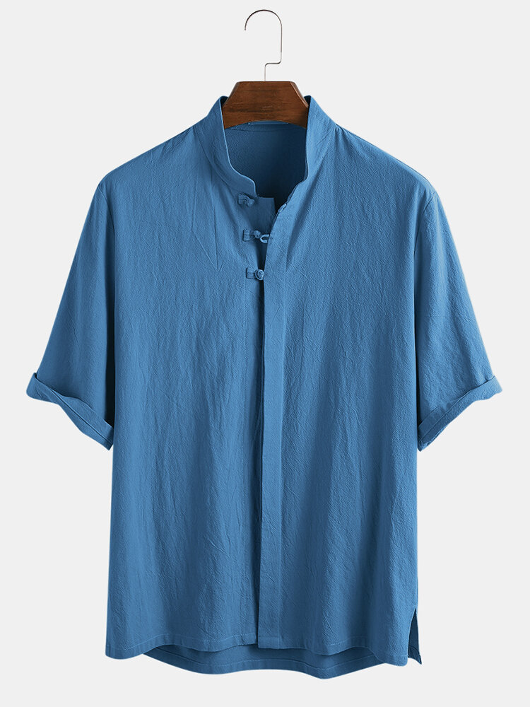 Item Type: ShirtsPattern Type: SolidGender: MenFit Type: FitStyle: Casual,FashionThickness: RegularCollar: Stand CollarSeason: SummerMaterial:CottonSleeve Length: 3/4 SleeveColor: Blue,White,Light GreenCuff Type: Straight SleeveOccasion: Leisure,Home,Daylife