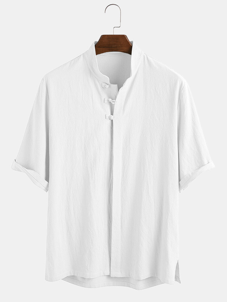 Mens 100% Cotton Oriental Ethnic Solid Color Stand Collar 3/4 Sleeve Shirts – White M