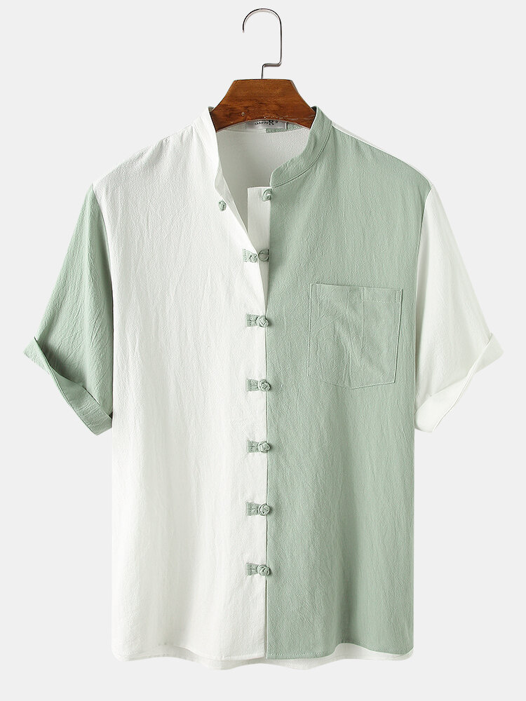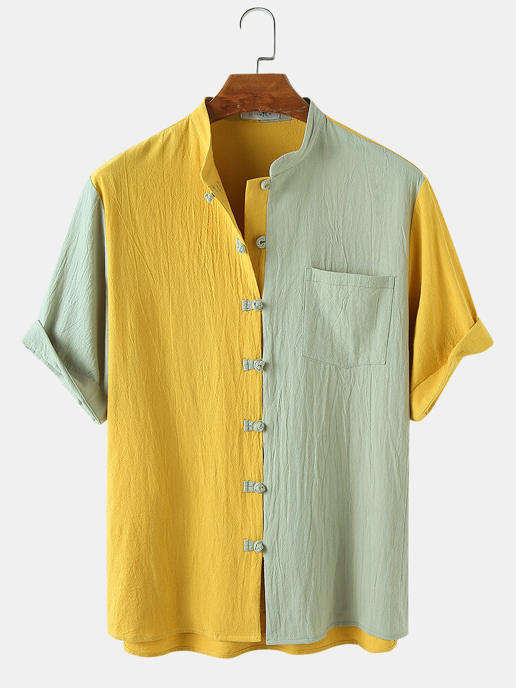 Brand:TWO-SIDEDDecoration:Pocket,Button,SplicingMaterial:CottonNeckline:Stand CollarPattern Type:PatchworkScene:Leisure,Home,CasualSeason:Spring,Summer,autumnSize:XXL,L,S,XL,MSleeve:Short SleeveStyle:CasualThickness:Regular