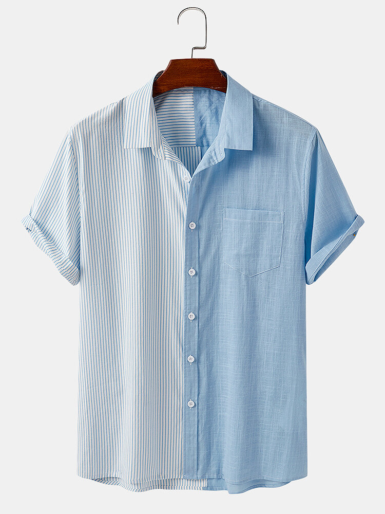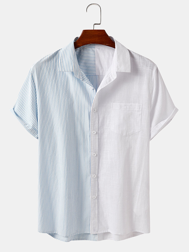 Mens 100% Cotton Patchwork Striped Solid Color Pocket Shirts – White S