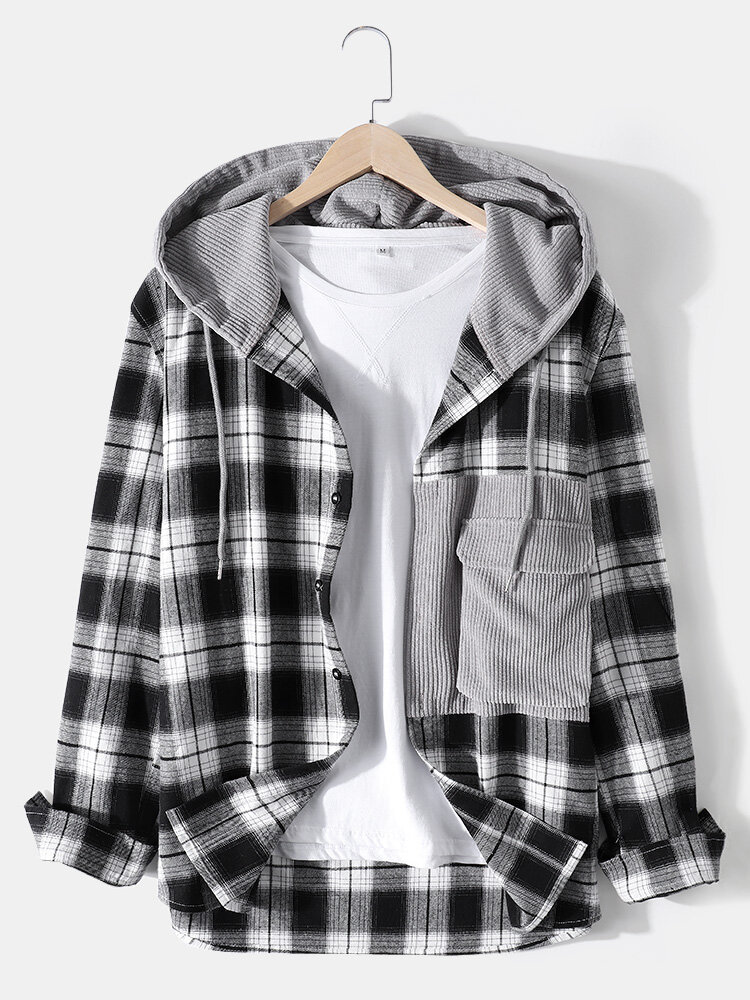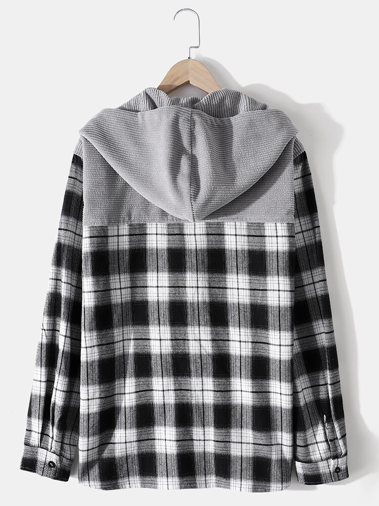 Mens 100% Cotton Plaid Patchwork Button Up Hooded Shirts – S Black