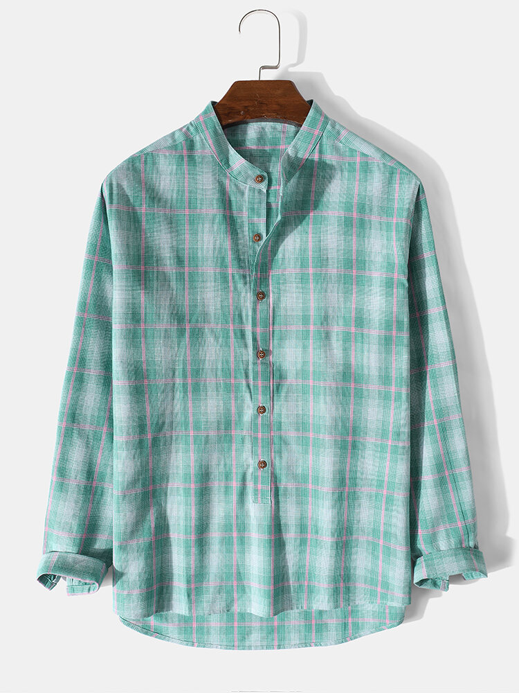 Mens 100% Cotton Plaid Stand Collar Long Sleeve Henley Shirts – Black S