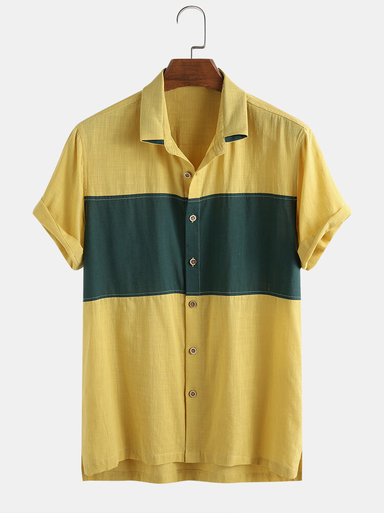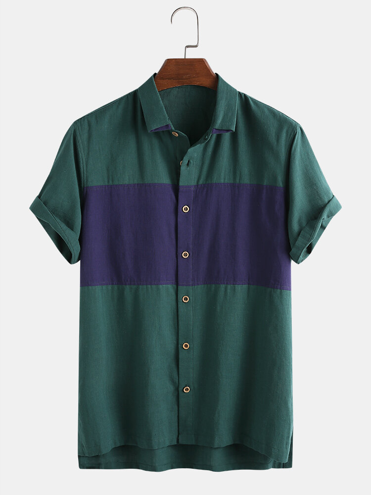 Mens 100% Cotton Soft & Breathable Color Block Patchwork Short Sleeve Shirts – Green XL