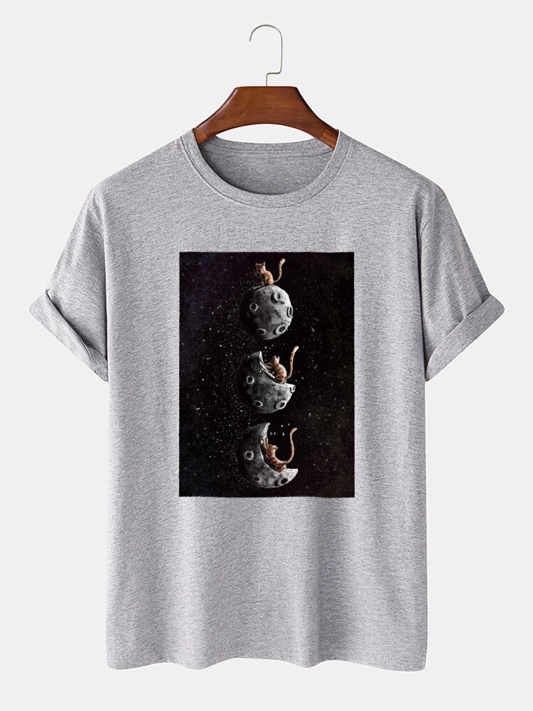 Mens 100% Cotton Space Cat Graphic Print Casual Short Sleeve T-Shirt – Black S
