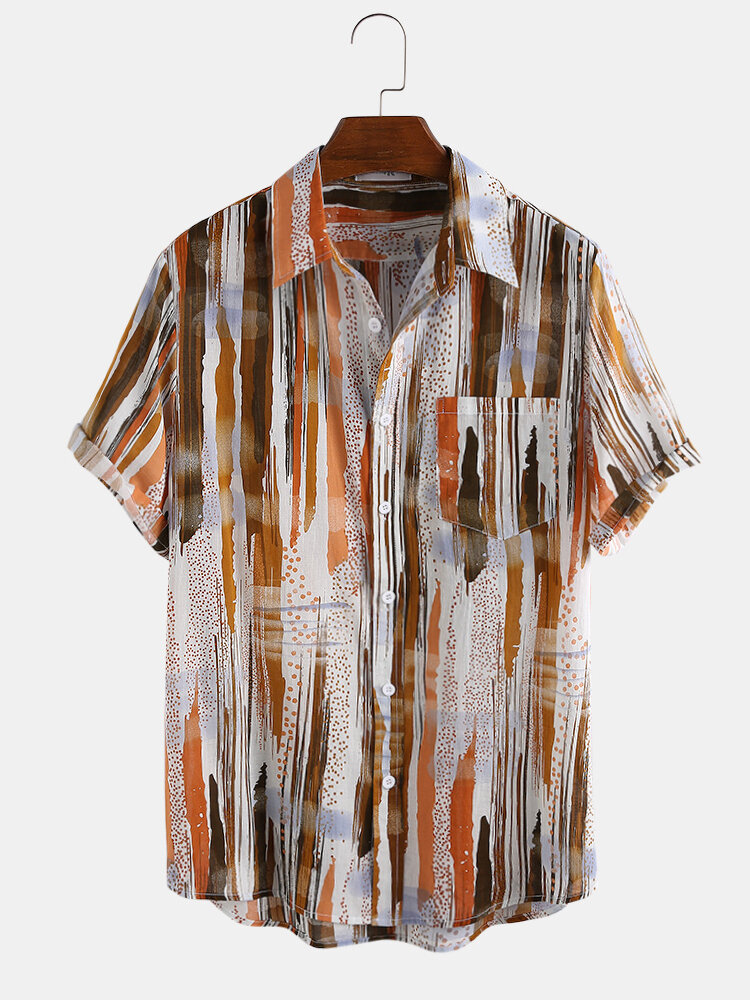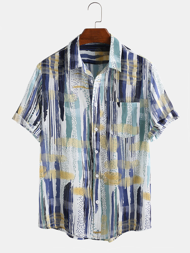 Mens 100% Cotton Splash Ink Stripe Patch Pocket Breathable Short Sleeve Casual Shirts – Blue M