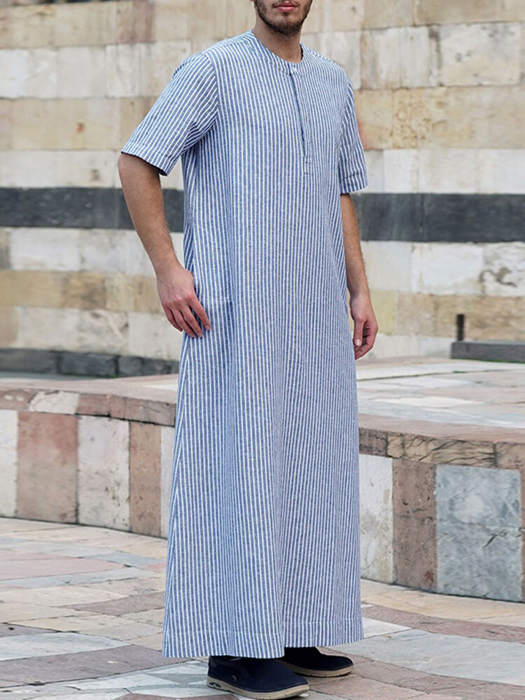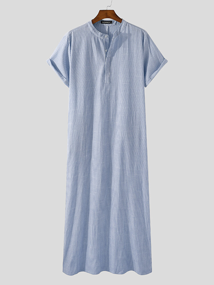 Mens 100% Cotton Striped Casual Robe Kaftan – Blue S