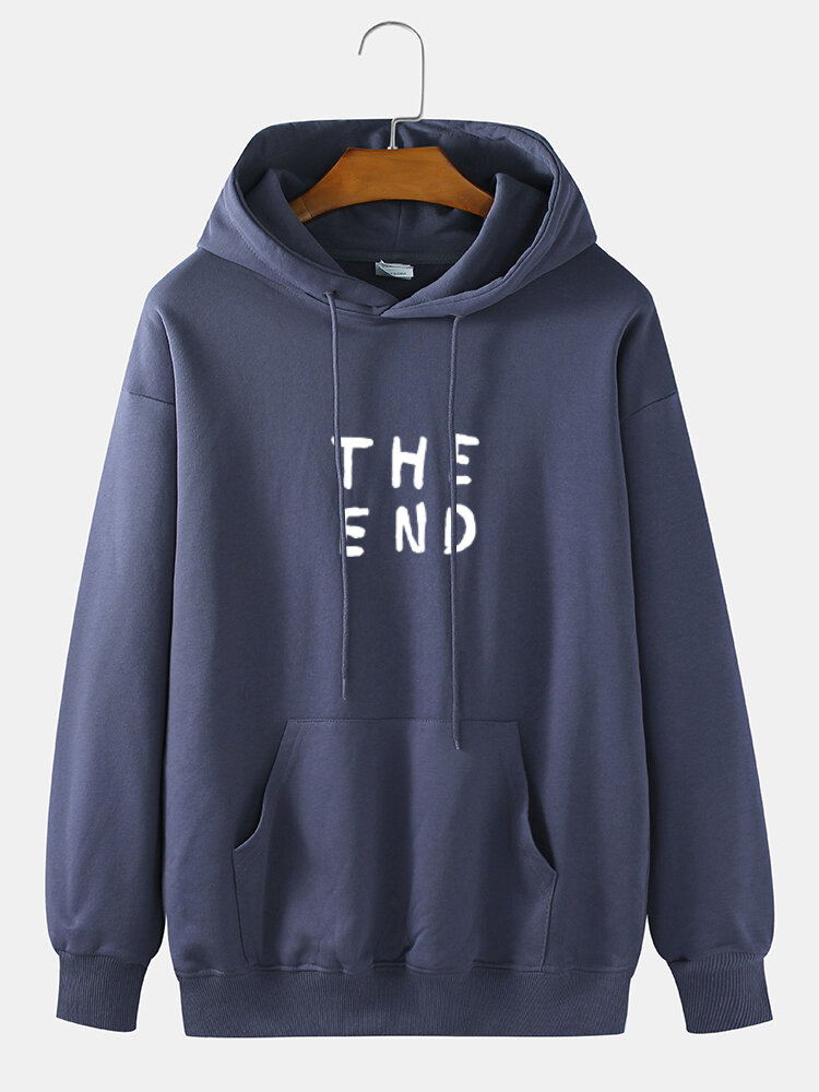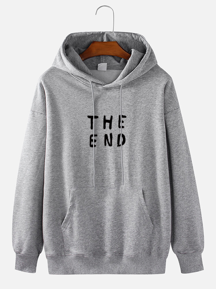 Mens 100% Cotton The End Letter Print Solid Color Daily Hoodie – White M