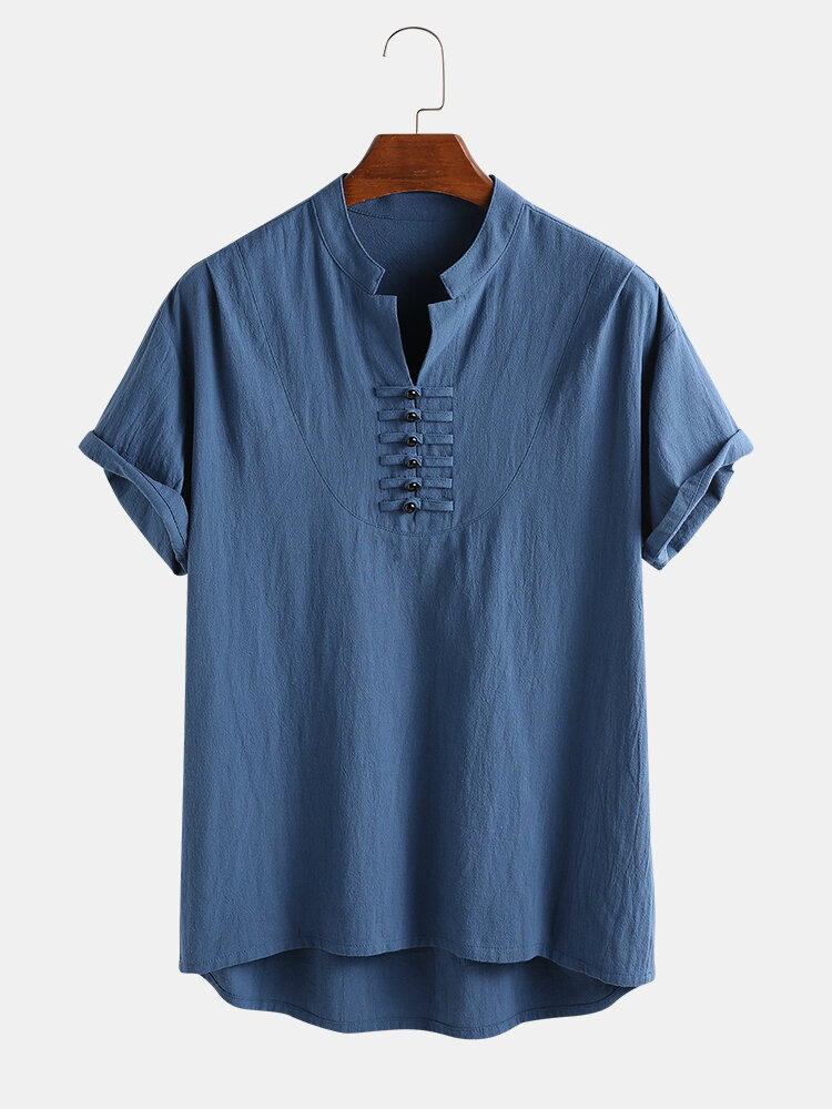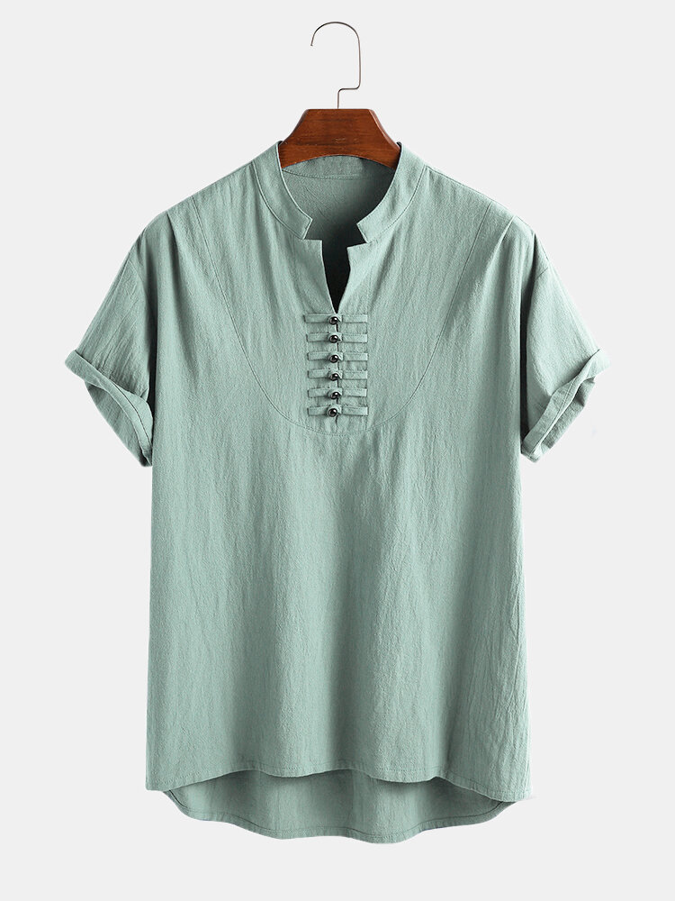 Mens 100% Cotton V Neck Breathable Oriental Button Short Sleeve Casual Henley Shirts – Green M