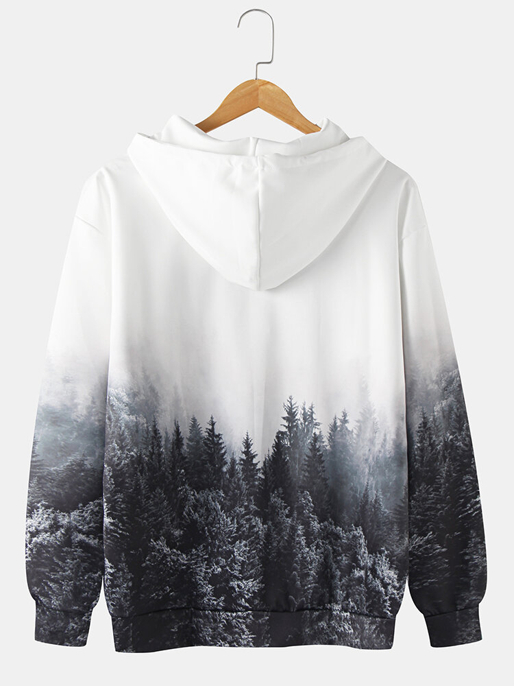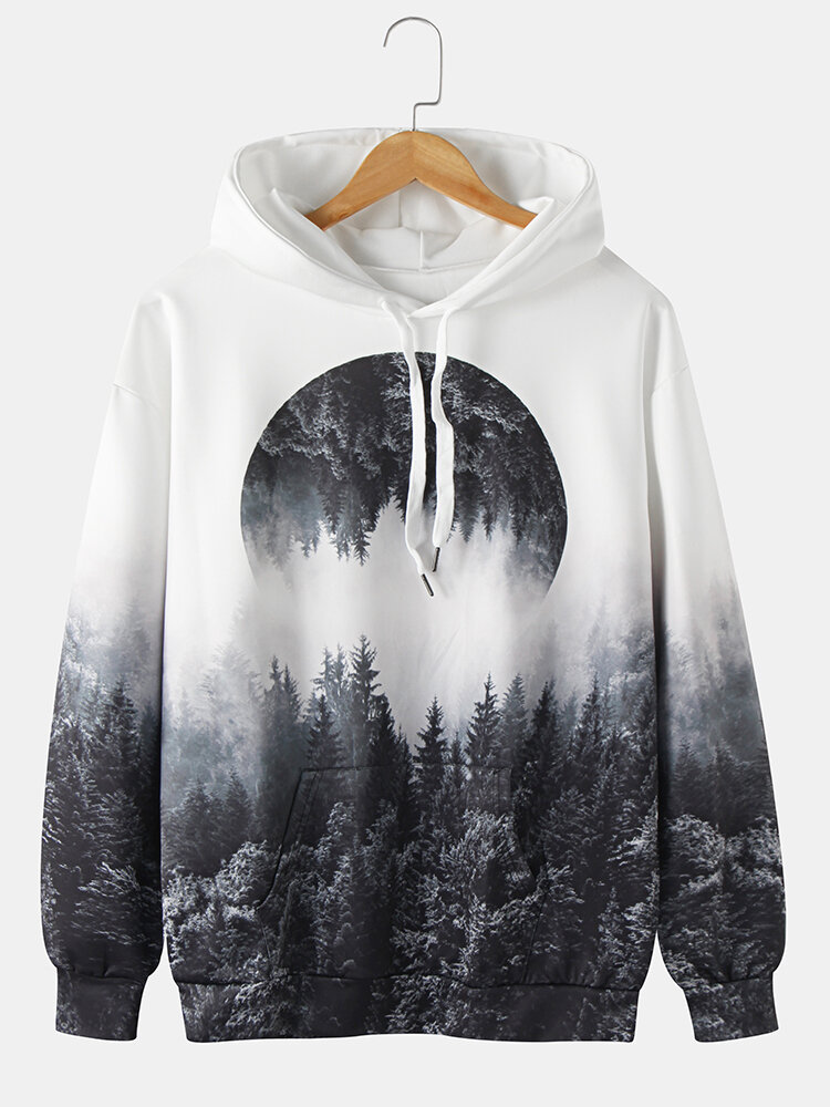 Mens 3D Forest Landscape Print Kangaroo Pocket Drawstring Hoodies – White S