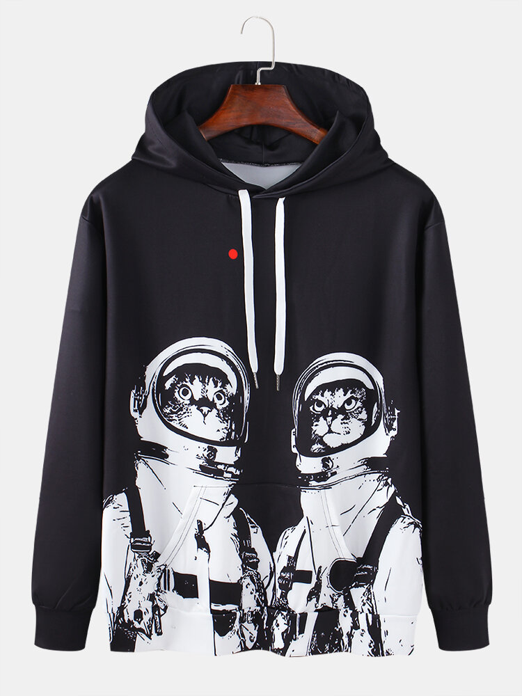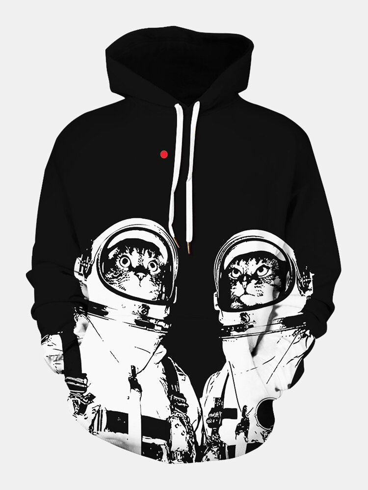 Mens 3D Funny Astronaut Stars Print Loose Kangaroo Pocket Drawstring Hoodies – Black XL